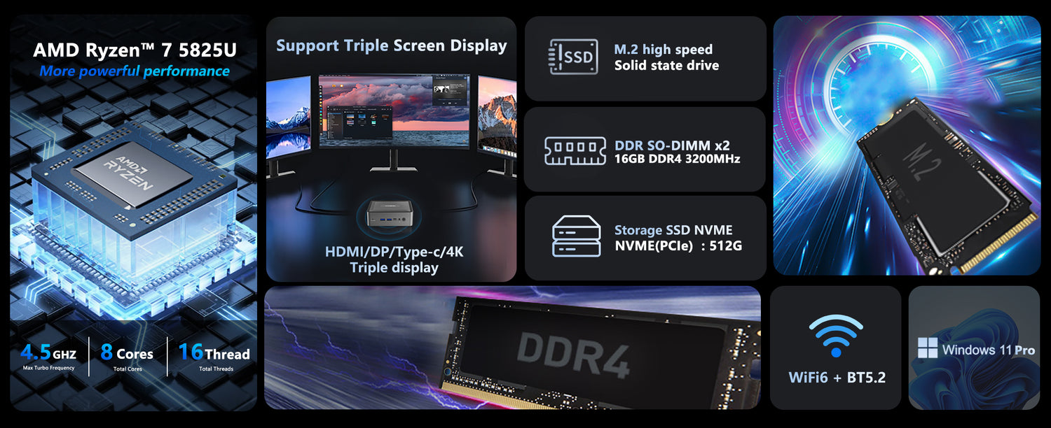 AMD Ryzen™ 7 5825U (8 core 16 lines 4.5GHz L2 4MB L3 16MBAMD)