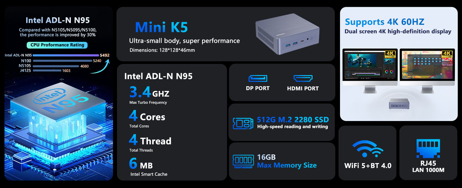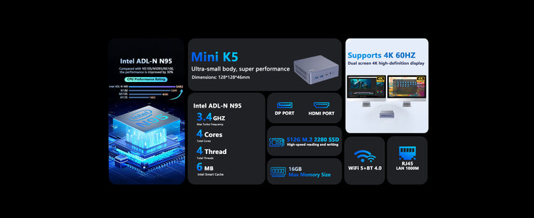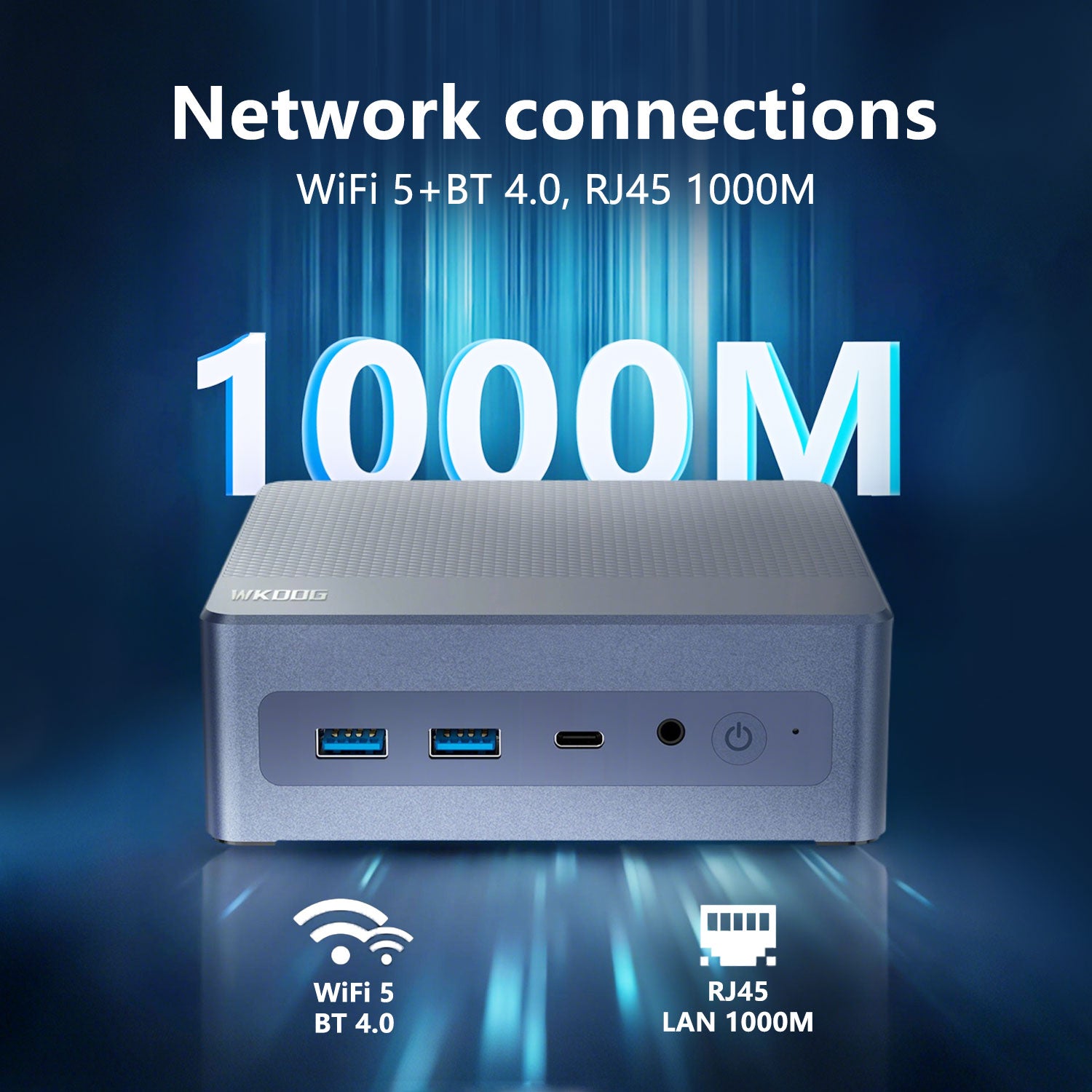 Looking for a compact yet powerful mini PC? Then look no further than the Mini K5! It excels in network connectivity. Supporting 2.4G+5G dual-band Wi-Fi, it meets your needs, whether you're looking for a stable signal or demanding high-speed internet. Equipped with an RJ45 LAN 1000M high-speed network port, it easily handles daily office work, online learning, HD video streaming, and smooth gaming, allowing you to enjoy a stable, high-speed network experience.